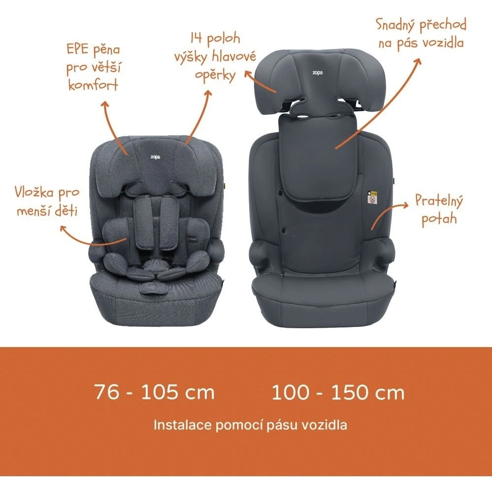 Dětská autosedačka Zopa Alfa i-Size je určená pro dlouhodobé využití. Díky její snadné výškové úpravě je vhodná pro děti od 15 měsíců až do 12 let. Do vozidla se instaluje po směru jízdy.Tento tip připevníte velmi snadno pomocí bezpečnostního pásu vozidla. Pokud máte v autě systém isofix, můžete využít vatiantu autosedačky s isofixovými konektory.