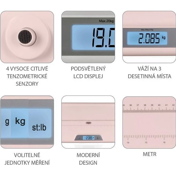 Digitální dětská váha Zopa vám zajistí ultra přesné vážení vašeho miminka. Je tedy ideálním pomocníkem, pokud si potřebujete převážit, kolik miminko vypilo mléka a podobně. Váha má vysoce přesné tenzometrické senzory.Měření je ukazováno na přehledném displeji na tři desetinná místa s měřícím rozsahem od 0,05 kg do 20 kg. Váha má na sobě také metr, díky kterému můžete sledovat růst vašeho miminka do výšky.