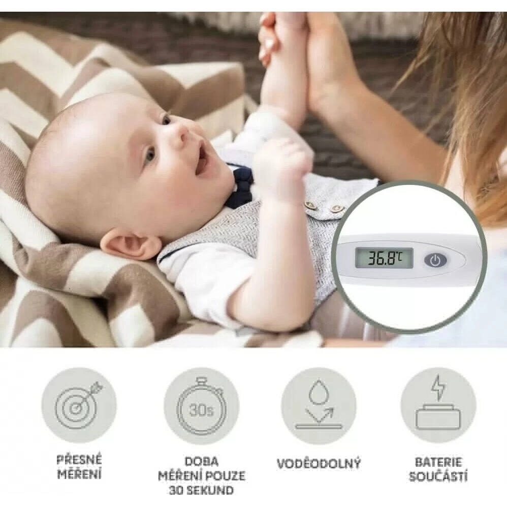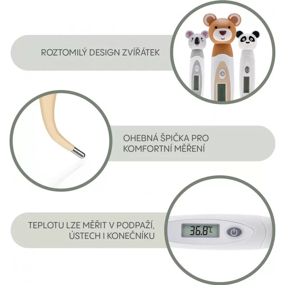 S veselým zvířátkem, které si děti oblíbí, rychle opadne strach z měření teploty. Teploměr Zopa měří digitálně a je velmi přesný a rychlý.Můžete měřit rektálně, orálně nebo pod paží. Teploměr měří s přesností 0,1 od 32 do 43°C. Teplotu změří pod 30s a zvukovým signálem upozorní na konec měření. Voděodolný design zajišťuje bezpečné a snadné čištění teploměru, a pružná silikonová špička zajišťuje komfortní a bezpečné použití bez rtuti.