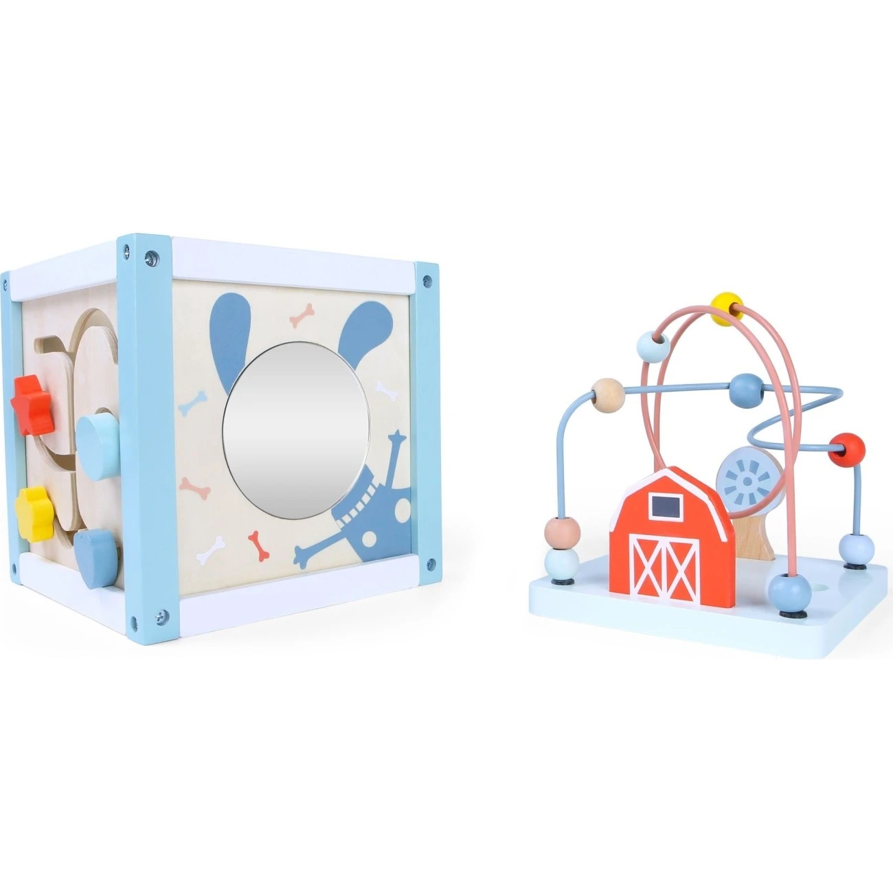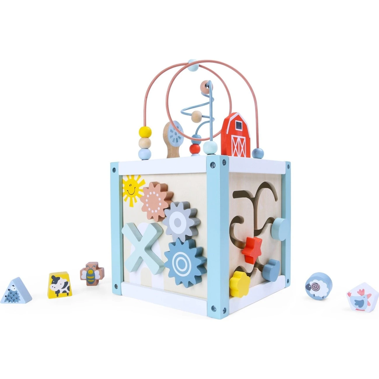 Velmi edukativní dětská hračka podporuje přirozené a zábavné učení. Ze všech stran nabízí mnoho aktivit pro zkoumání a rozvoj jemné motoriky.S dřevěnou aktivity kostkou se děti mohou naučit tvary, barvy, počty i zvířátka. Podporuje také logické myšlení a představivost.