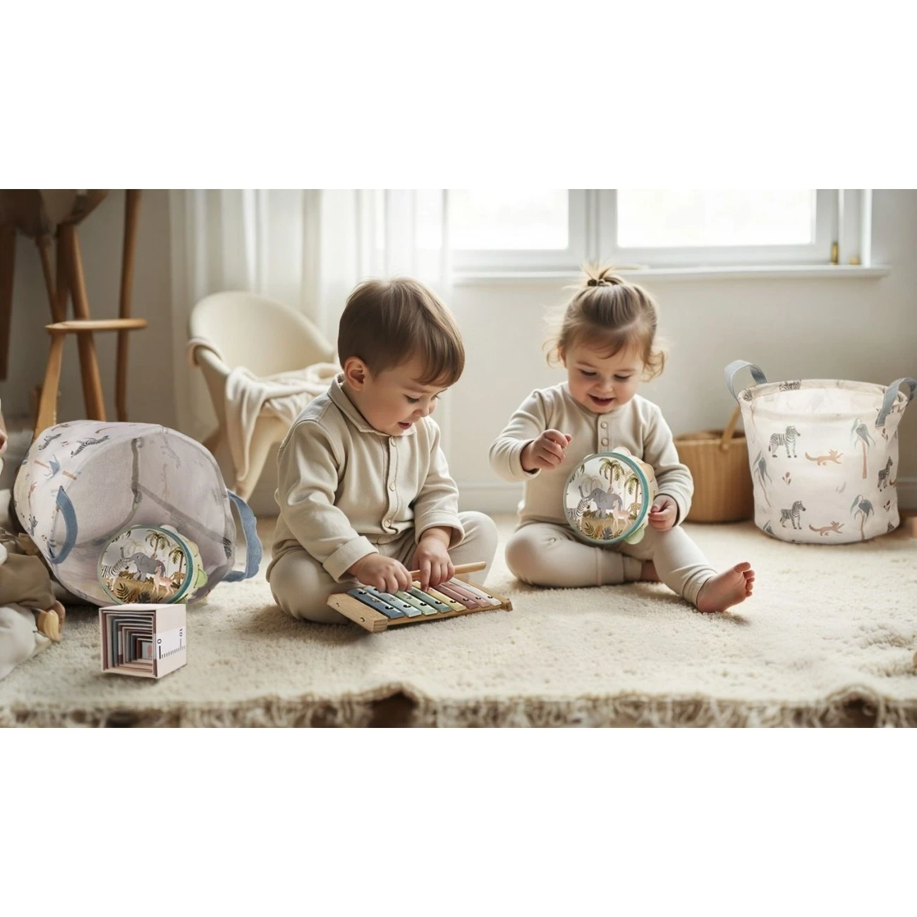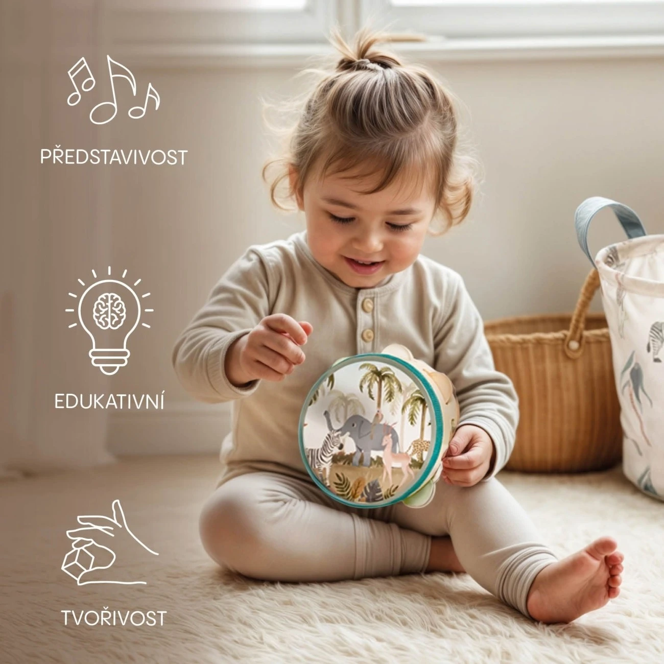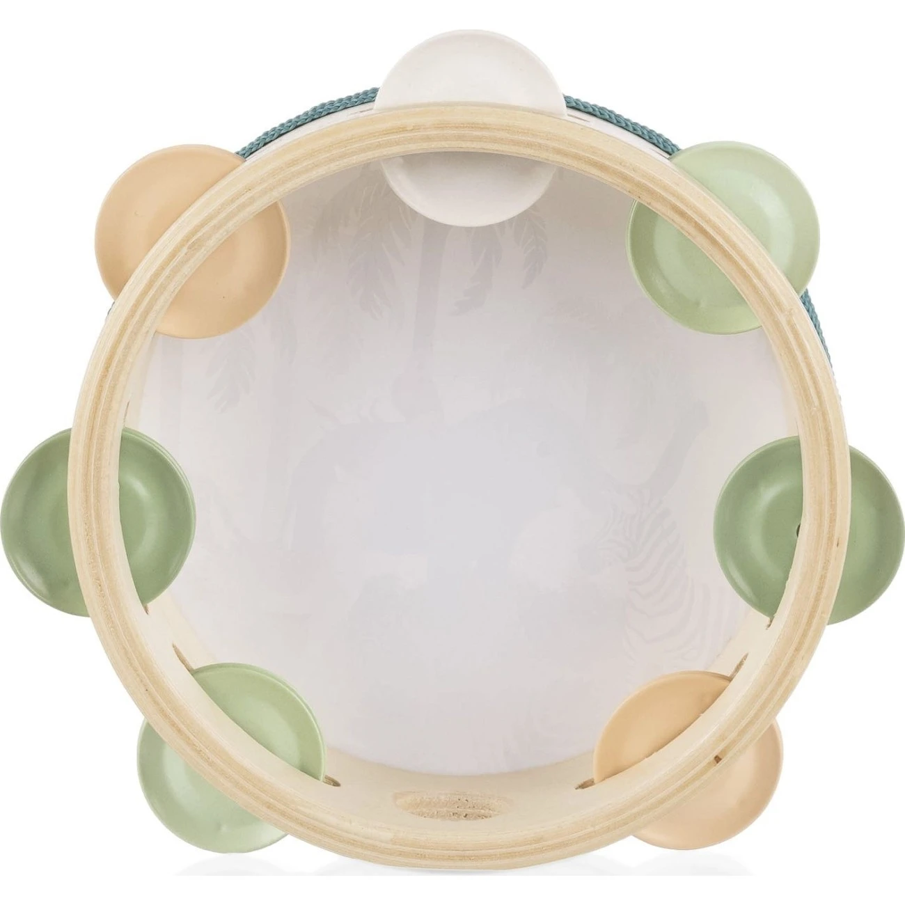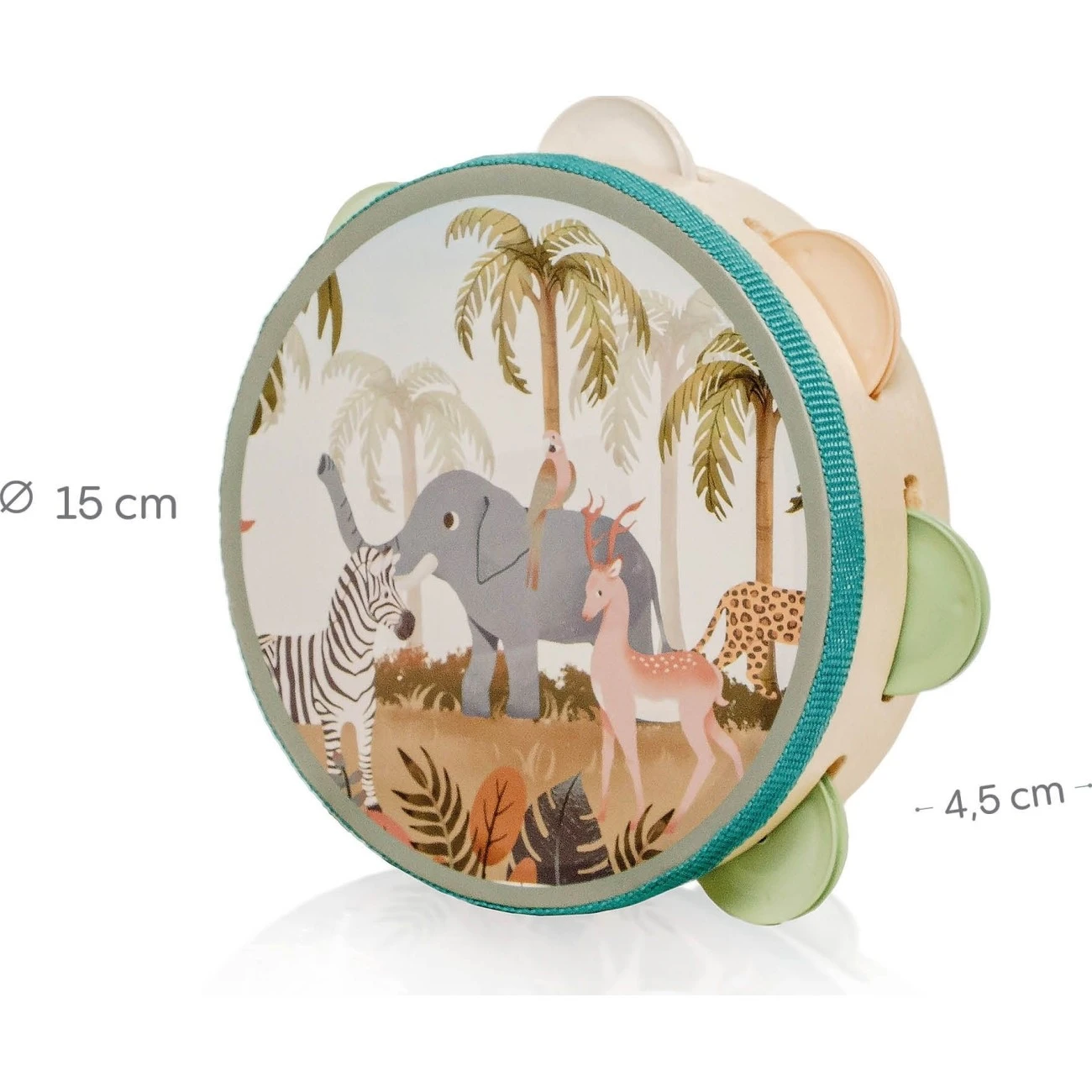 Dětská dřevěná tamburína Zopa je inspirována montessori principy. Podporuje lásku k hudbě, radost z pohybu i vnímání rytmu.Tamburína má průměr 15 cm a je hluboká 4,5 cm. To je ideální velikost pro dětské ruce. Tamburína obsahuje 7 barevných rolniček, které vydávají velmi příjemný zvuk. Průhledná plocha s motivem zvířátek je vizuálně velmi atraktivní.
