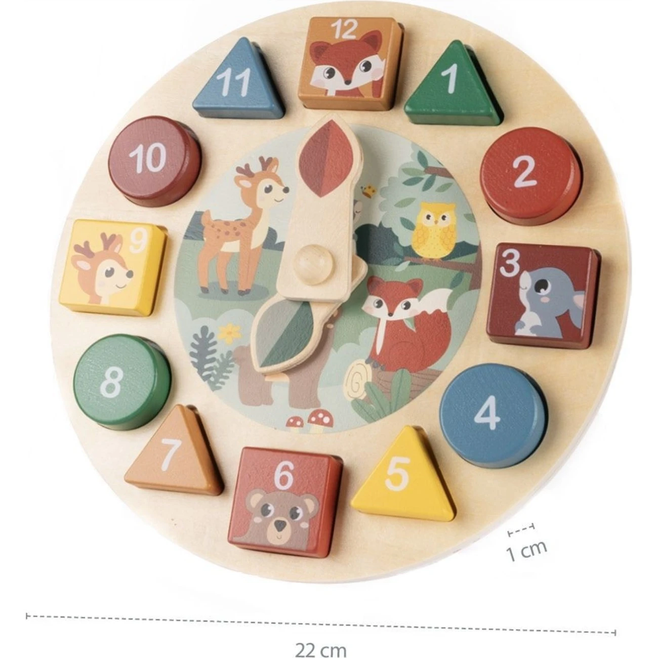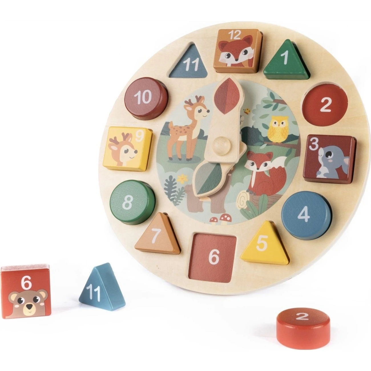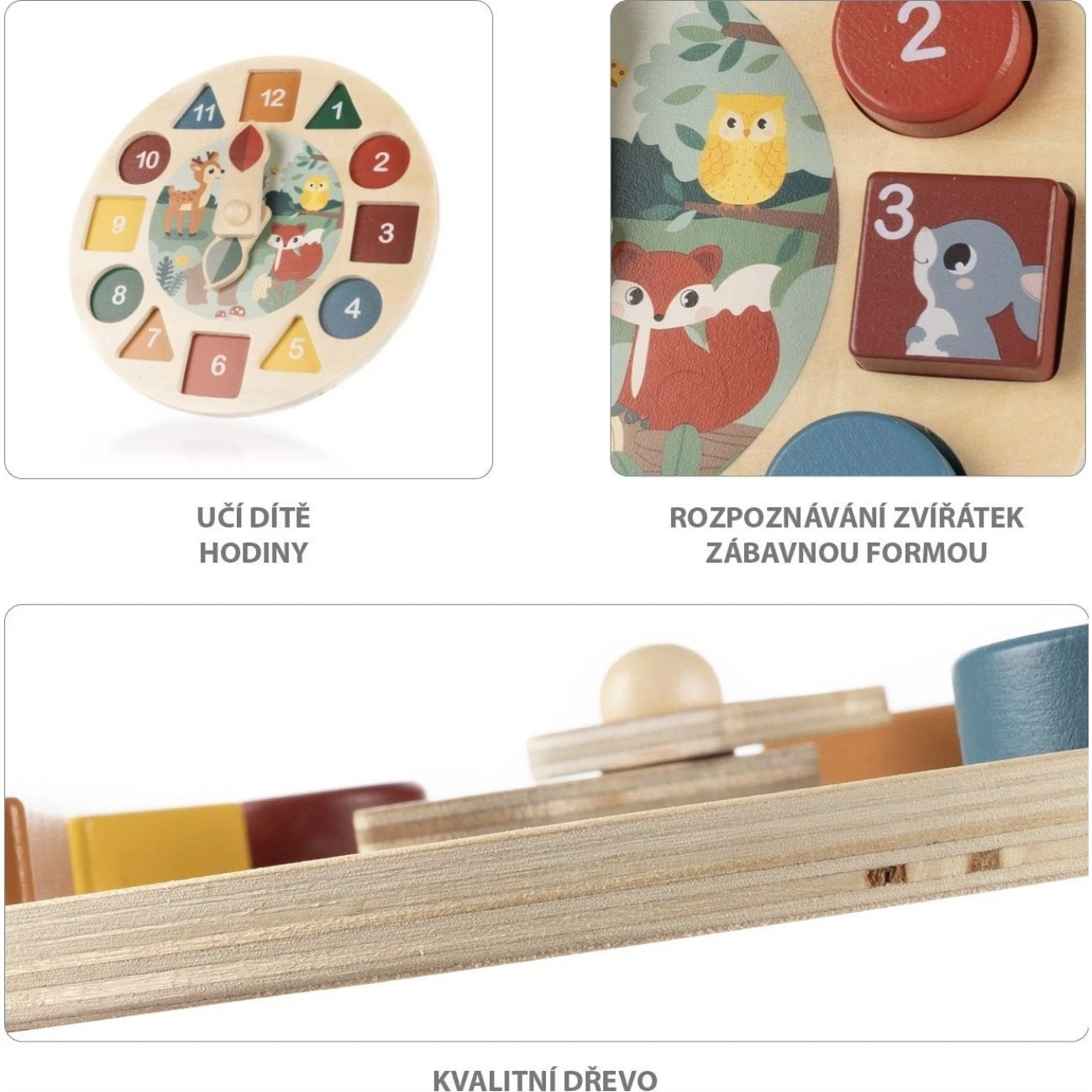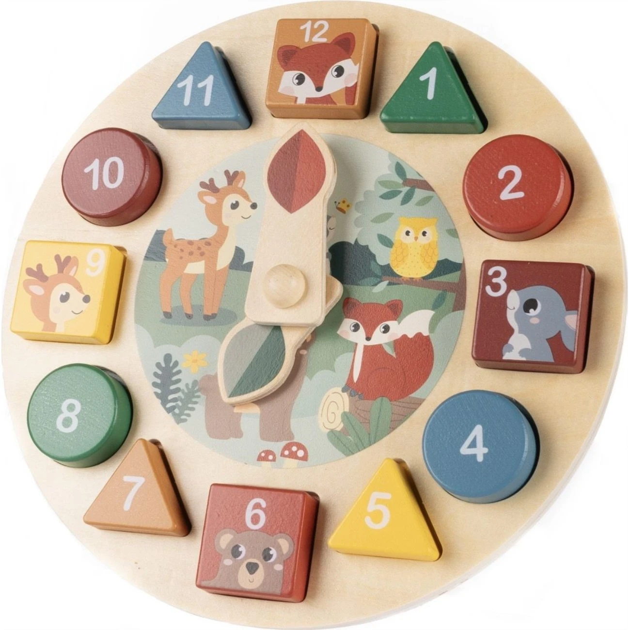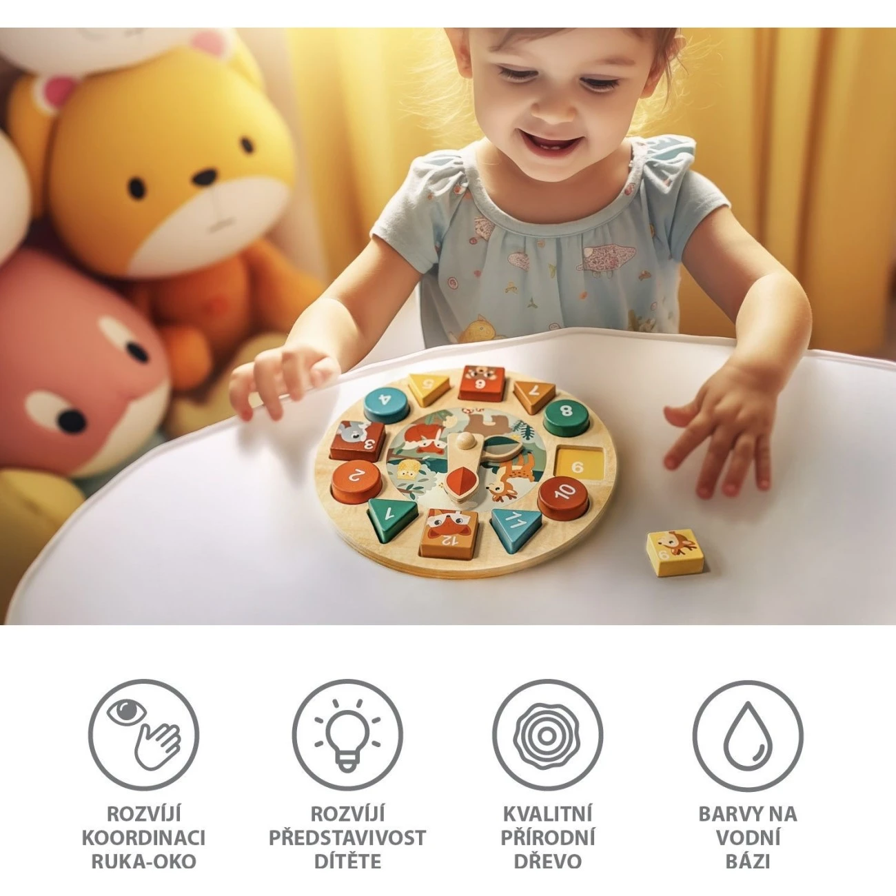 Když je učení zábava, jde to samo! Zopa dřevěné aktivity hodiny poslouží k učení čísel od 1 do 12, zvířátek, tvarů, barev i hodin.Skvěle podporují rozvoj jemné motoriky i logického myšlení. Jsou vhodné cca od 2 let. Vyrobené z odolného dřeva a netoxických barev.