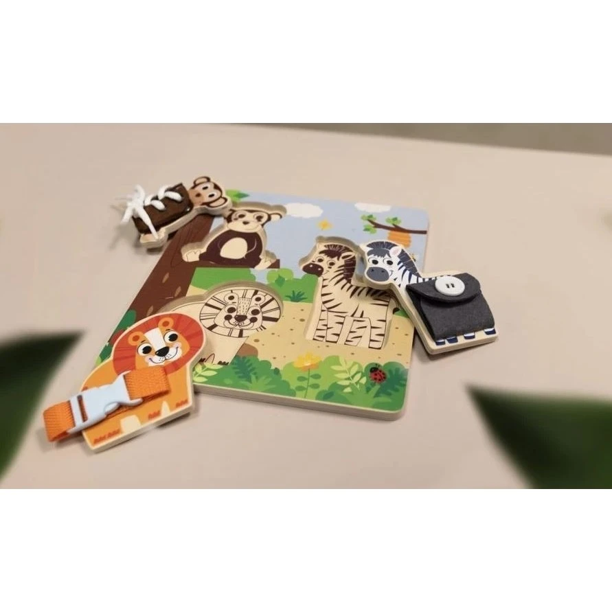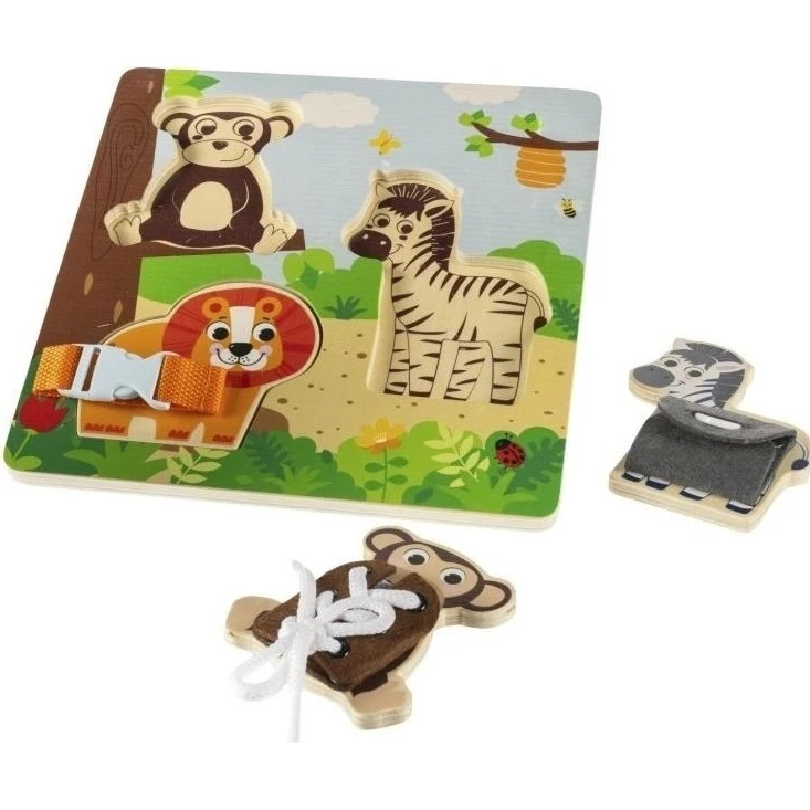 Zopa dřevěné montessori puzzle Wood nejsou jen obyčejnou vkládačkou. Nabízí mnoho prvků, které jsou inspirované montessori principy a děti díky nim rozvíjí jemnou motoriku i koordinaci ruka-oko.Děti bude velmi bavit objevovat přezku, kapsičku s knoflíčkem i tkaničky. Mohou se s puzzlemi učit rozeznávat zvířátka i vnímání prostoru a procvičování tvarů.