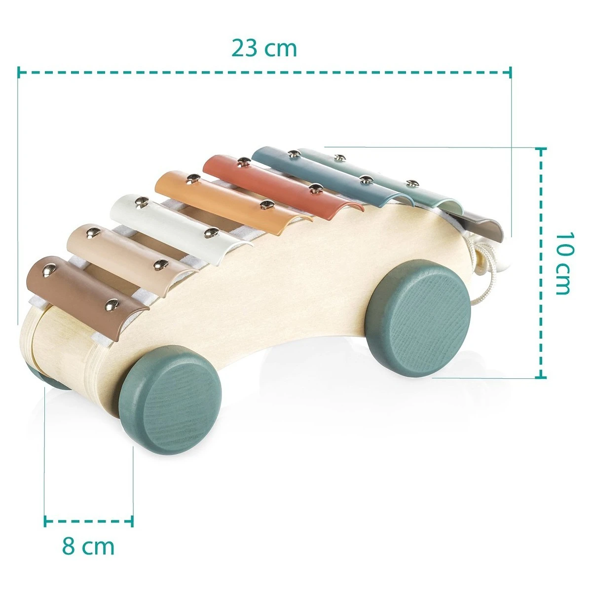 Rozměry xylofonu jsou 10 cm na výšku, 8 cm na šířku a 23 cm na délku, což z něj činí kompaktní hračku vhodnou pro děti od 1,5 roku věku. Jeho lehká konstrukce umožňuje snadnou manipulaci i pro nejmenší děti.