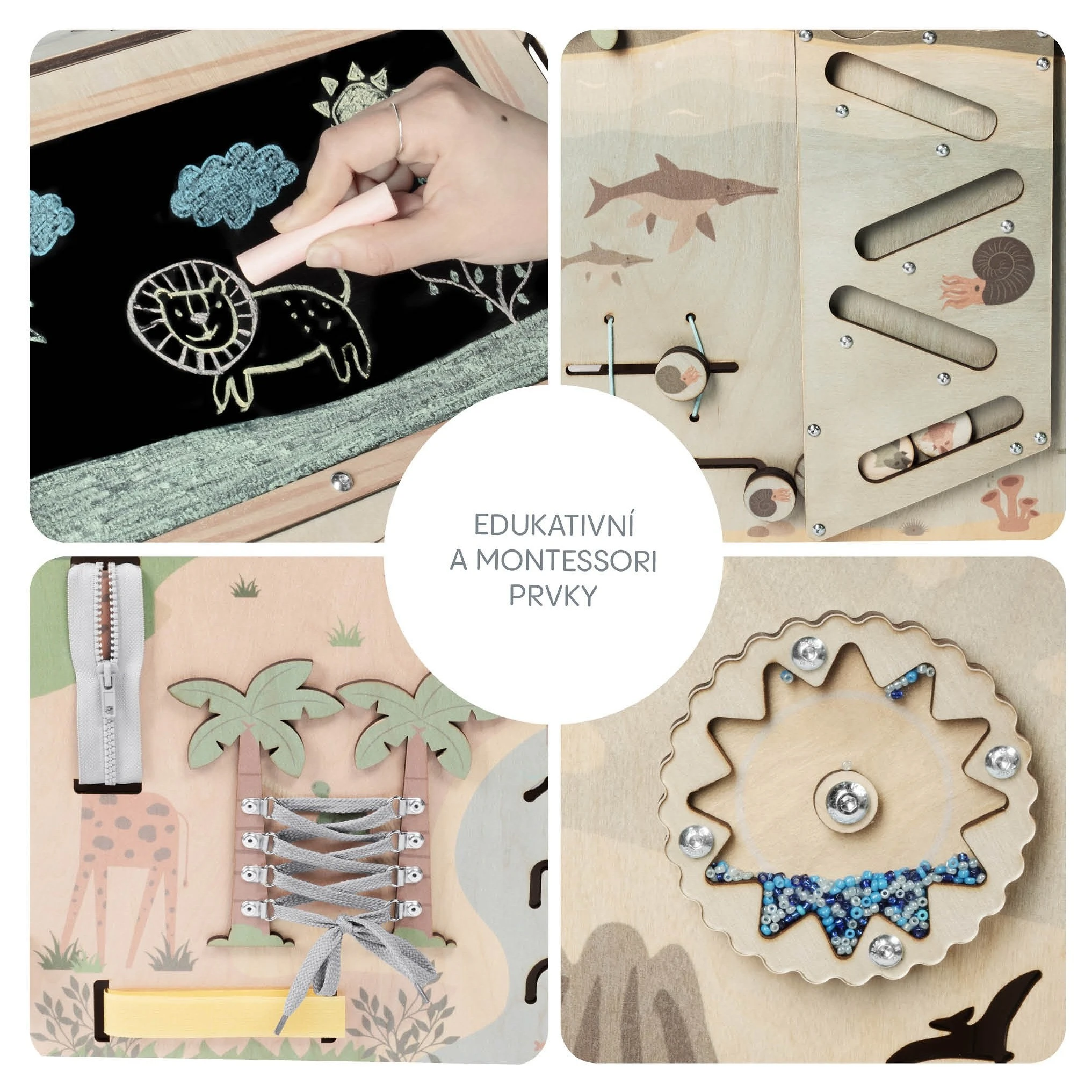 Na bočních stranách děti najdou zipy, šňůrky, obrázky na otáčení i vypínač.