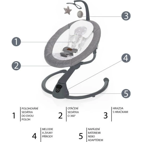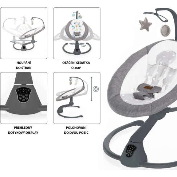 Je možné zapnout funkci automatického zapnutí při detekci pohybu dítěte, nebo také dobu houpání na 8, 15 či 30 minut. Vše snadno ovládáte na dotykovém panelu, nebo dálkovém ovladači. Napájet je lehačku možné adaptérem nebo pomocí baterií.