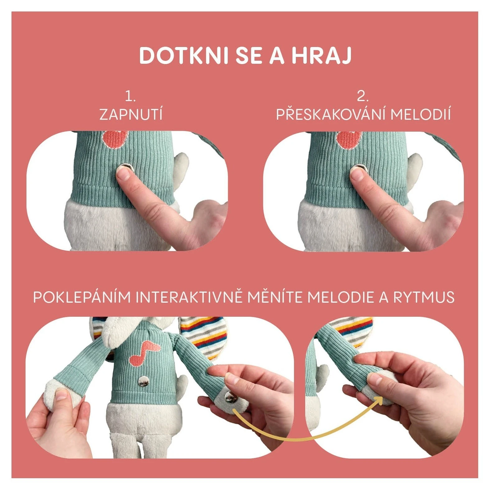 Na ručičkách zvířátka se nachází interaktivní režim. Stačí přidržet tlačítko na jedné ručce a jemně dotýkat druhé, čímž se aktivuje režim reagující na doteky. Hudba se přizpůsobuje tempu poklepávání, což umožňuje dítěti vytvářet vlastní zvukové kombinace a podporuje jeho smyslové vnímání, jemnou motoriku a přirozenou zvědavost.