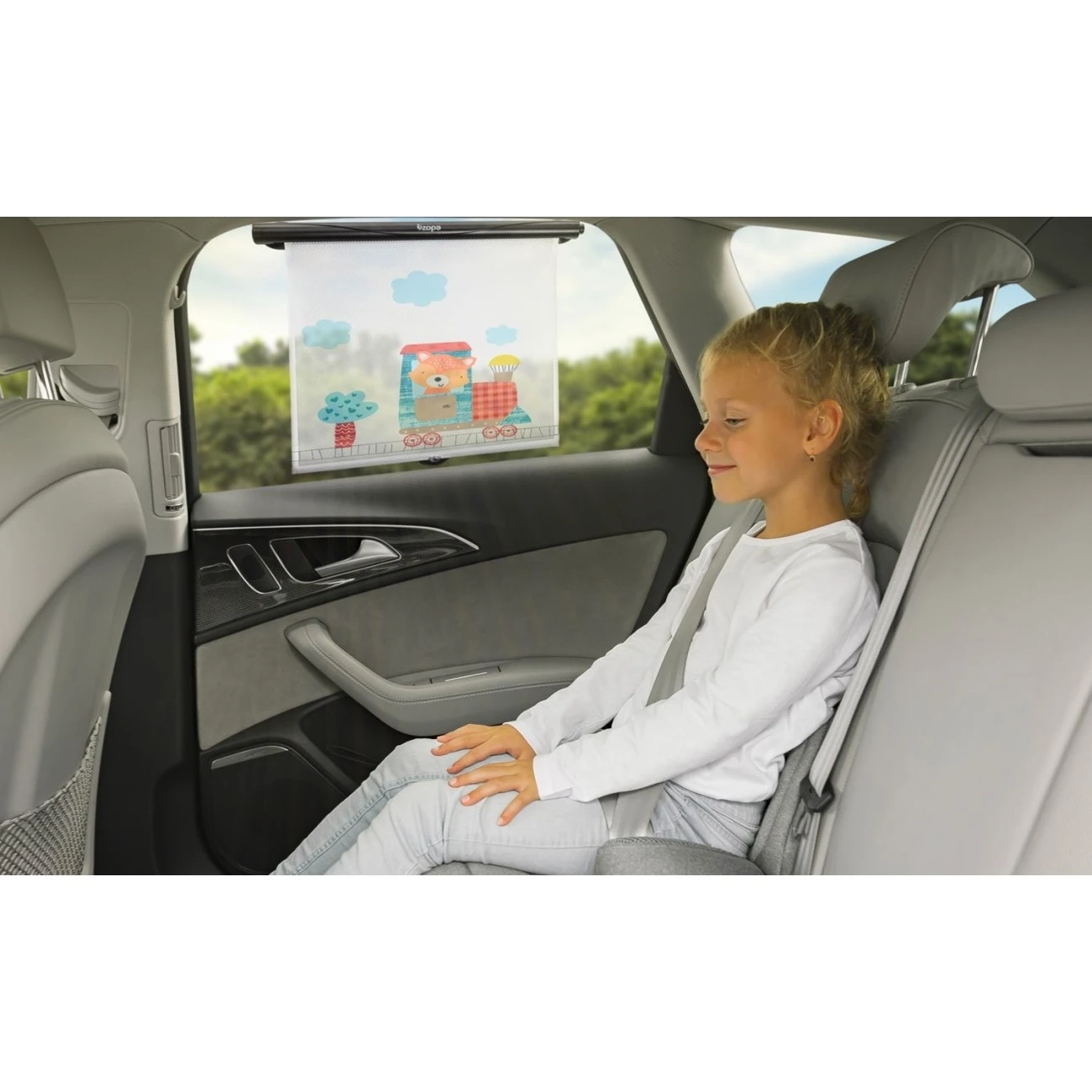 Roztomilá liška bude dětem skvělým parťákem na cestách. Rolovací sluneční clona Zopa je ochrání před škodlivým UV zářením.Clona přitom neblokuje výhled z okna a upevní se snadno pomocí praktických paprsků. Clona obsahuje tlačítko, po jehož stisknutí se clona sroluje zpět.