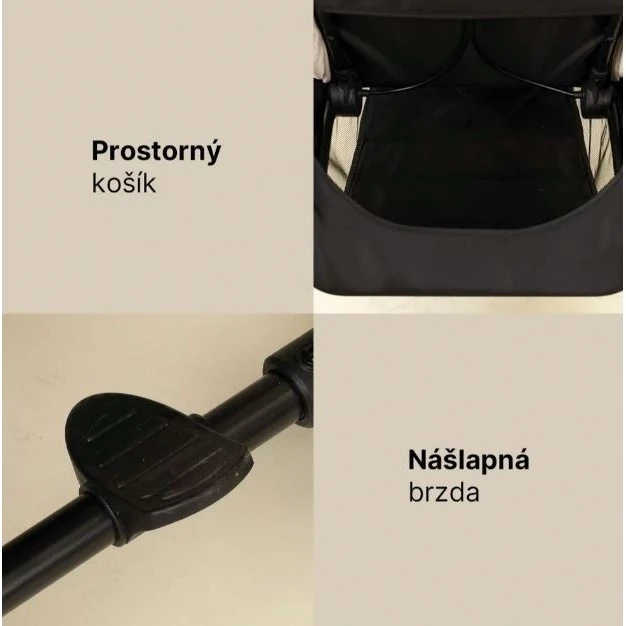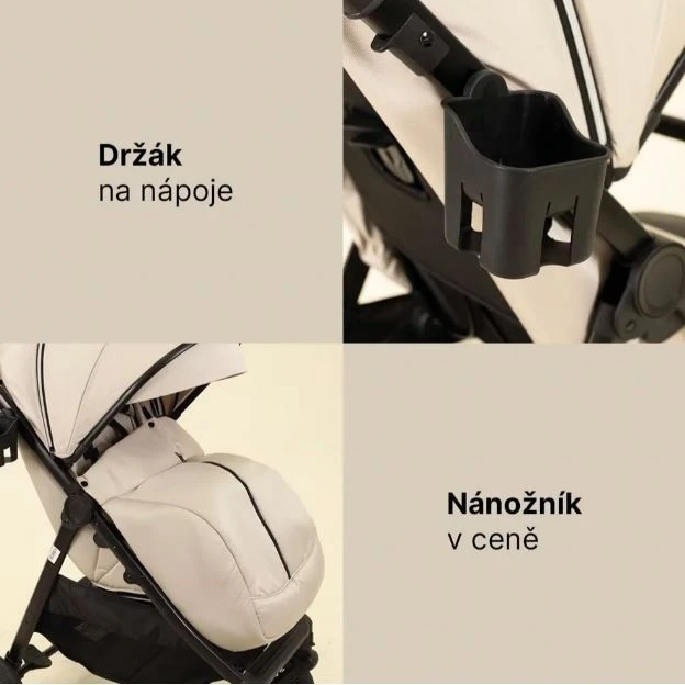 *Bohaté příslušenství v ceně - nánožník, držák na pití, pláštěnka, přídavná odklápěcí hrazda, praktická kapsička, velký nákupní košík