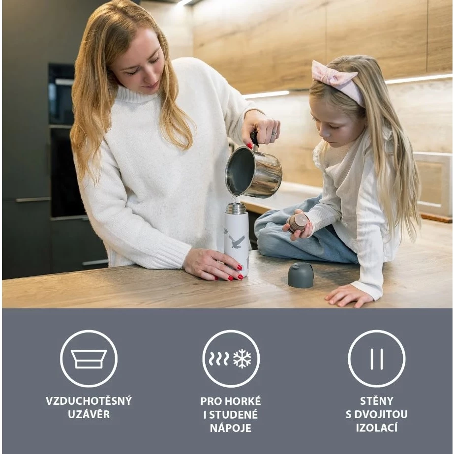 Udržujte své nápoje na ideální teplotě po celý den s touto kvalitní termoskou o objemu 400 ml. S jejím moderním designem a vynikajícími izolačními udrží tekutiny teplé až 12 hodin a studené až 24 hodin.Termoska je vyrobena z prvotřídní nerezové oceli, je odolná vůči korozi a garantuje dlouhou životnost. Těsné víčko účinně zabraňuje protékání a vrchní uzávěr pro snadné nalévání zajistí, že se nepolijete ani při jízdě na nerovné cestě, což je ideální pro aktivní rodiče. Kromě toho, víčko termosky lze pohodlně použít jako hrníček.