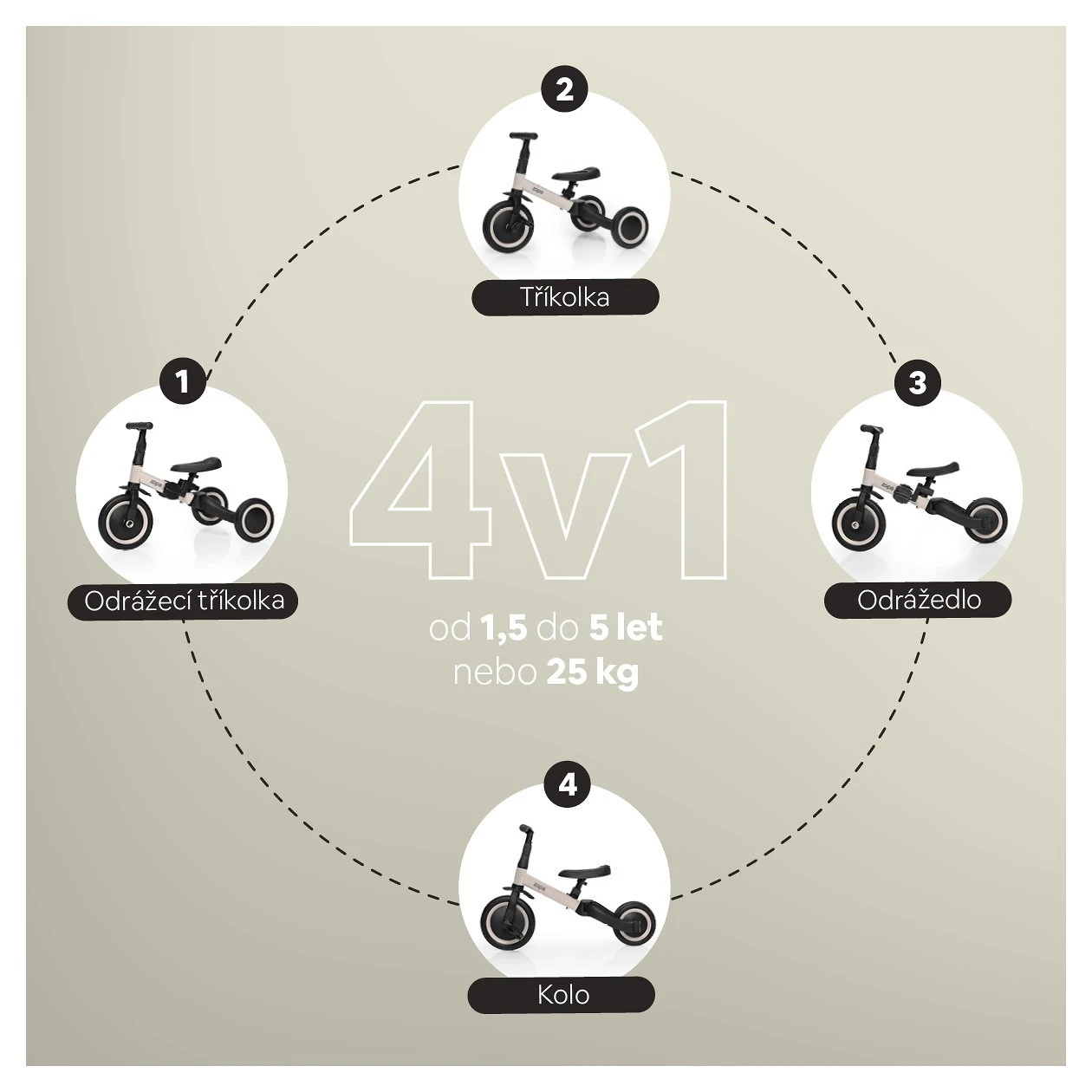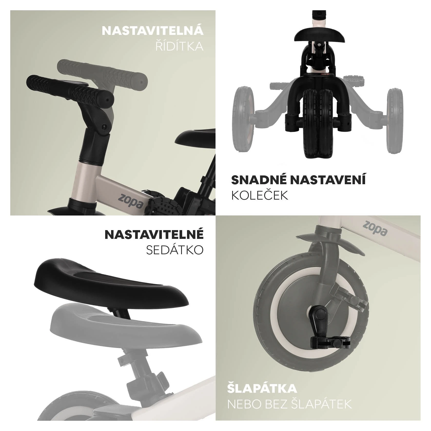 ZOPA Tříkolka Razor Easy je inovativní dětské vozítko, které se přizpůsobuje růstu a vývoji vašeho dítěte od 18 měsíců až do 5 let. Díky své multifunkční konstrukci nabízí čtyři různé režimy použití, což z ní činí ideálního společníka pro malé dobrodruhy.4v1: Tříkolka, odrážedlo a kolo v jednom